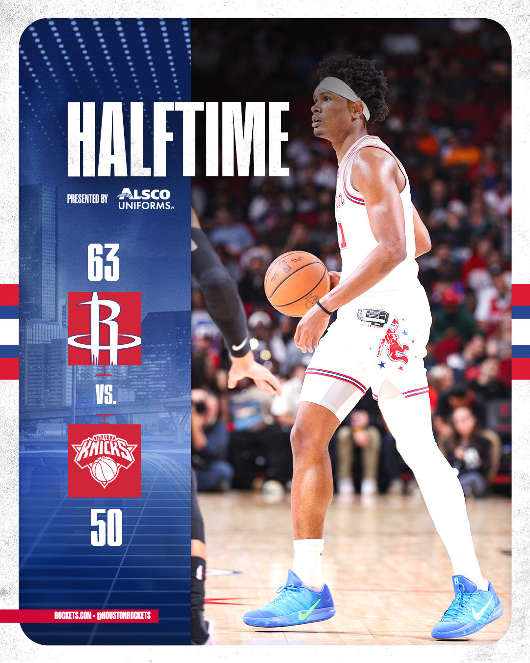 火箭队的杜兰特得到27分、6个篮板和8次助攻,谢泼德得到20分和5个篮板,伊森得到17分和8个篮板,汤普森得到17分、4个篮板和8次助攻,史密斯得到15分和6个篮板,申京得到13分、5个篮板和10次助攻。尼克斯队的唐斯得到22分和8个篮板,哈特得到13分和5个篮板,布伦森14投5中,得到12分、6个篮板和8次助攻,阿尔瓦拉多得到12分,克拉克森得到10分。